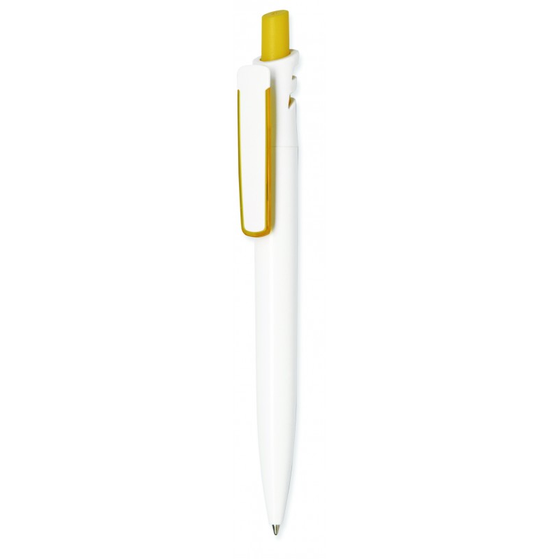 Ручка пластиковая ТМ Viva Pens - Grand Classic Bis. Подача стержня с помощью кнопки. Клип и корпус - белые, непрозрачные. Кнопка и накладка на клипе - цветные, непрозрачные.