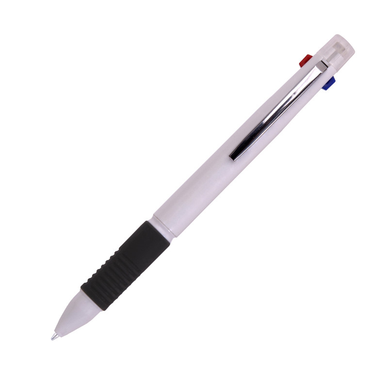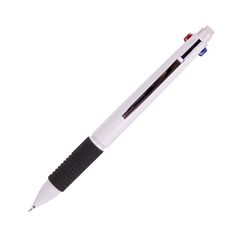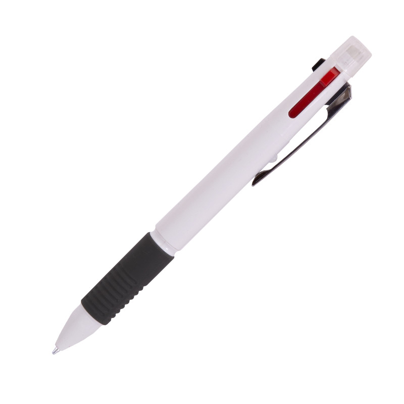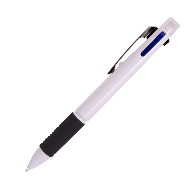 Пластиковая многофункциональная ручка 4 в 1 с белым корпусом и мягкой силиконовой резинкой для удобного использования в руке. 4 функции в одной ручке: синий, черный, красный цвет чернил и карандаш. На конце ручки закреплена резинка для карандаша.