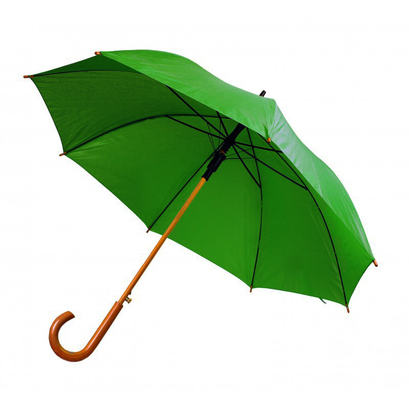 Зонтик имеет форму трости. Ее изогнутая ручка и стержень (основа) сделаны из натурального дерева, поэтому изделие достаточно легкое.