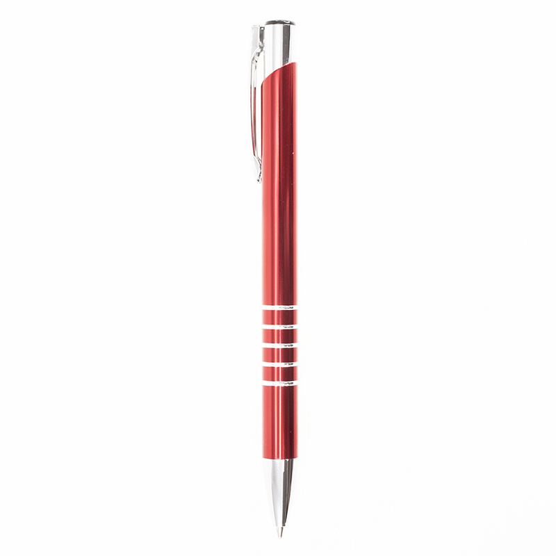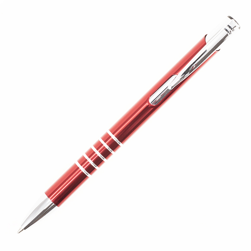 Металлическая анодированная алюминиевая ручка, кнопочный механизм, металлический хромированный клип-кнопка, 5 колец на зоне захвата, хромированный носик. Цвет гравировки - серебро. 136 мм.