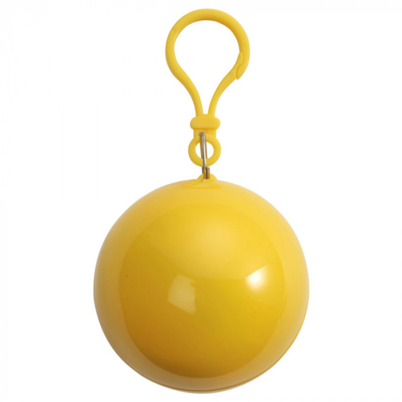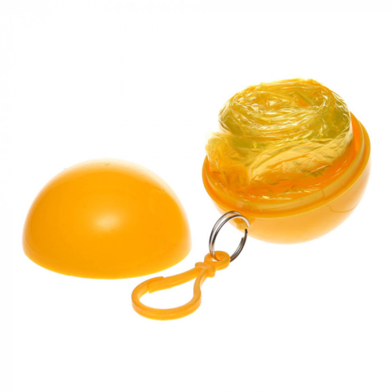 Легкий пончо-дождевик в круглом футляре. Футляр изготовлен из цветного пластика и оснащен карабином, что позволяет носить его в качестве брелока. Плащ изготовлен из полиэтилена.