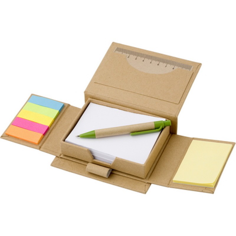 Настольный прибор для заметок с цветными стикерами и экологической ручкой.